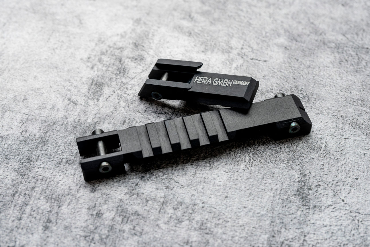HERA GMBH Schienensysteme für HK SL8 bzw. G36. Ermöglicht die Montage von kleinen Optiken nach MIL-STD. Ebenso erlaubt das Schienenset die erleichterte Nutzung des freiliegenden Durchladehebels.
